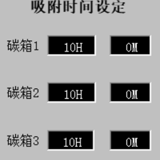 對尾氣做預處理,對于含水量較大尾氣需要在尾氣進入過濾裝置前用水汽分離裝置進行除水處理,否則會大大降低發熱管的使用壽命。含酸尾氣也要進行除酸處理,因為酸會腐蝕加熱管造成加熱管損壞。本案例共3個活性炭箱,依據時間設定(圖2)1號箱吸附時間到,如果2號、3號不在脫附階段就開始脫附,1號箱脫附時,2號、3號吸附,1號箱脫附完成后就進行吸附;2號箱吸附時間到如果1號、3號不在脫附階段就開始脫附,2號箱脫附時,1號、3號吸附,2號箱脫附完成后就進行吸附;3號箱吸附時間到如果1號、2號不在脫附階段就開始脫附3號箱脫附時,1號、2號吸附,3號箱脫附完成后就進行吸附,即3個箱輪流脫附。如果3個箱時間設定相同,首次通電如果3個箱吸附時間同時到達設定值,優先脫附順序為1號、2號、3號。