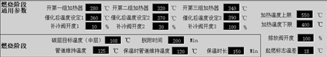 當炭層溫度到達設定溫度時,進入CO再加熱階段,此階段與CO預熱階段的控制幾乎一樣,可參照CO預熱階段。此階段需要設置的參數如圖5所示,當目標溫度(催化后溫度)達到設定值后CO再加熱階段結束。